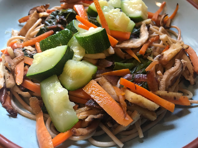 For those concerned about gas and bloating on a whole foods, plant-based diet, the body will adjust to a higher fiber intake, however, there are ways to help minimize digestive discomfort, including adding higher fiber foods like beans in slowly, with just a little at a time. You can watch my video about how we adjusted our meals to improve our digestion following suggestions in Ayurvedic medicine, below, or read my article on Tips to Improve Digestion, or How to Minimize Gas and Bloating ~ Recent Meals with Our Vata Reducing Dietary Revisions. According to Chinese food therapy and Macrobiotics, black soy beans, aduki beans, and small black turtle beans are good for the kidneys. Black soy beans have a slightly higher fat content, making them super creamy and tender when cooked properly. We also enjoy aduki (azuki/adzuki) beans, which look like small red beans with a tiny white stripe, chickpeas, lentils, and green or yellow split peas. Black sesame seeds also support the kidneys (in general, darker colored blue or black foods), and are taken daily as a tea to help maintain one's natural hair color, used by the Chinese emperors to keep their hair black. In the picture below, black sesame seeds are sprinkled on top of black soy beans as a garnish. Tender, Seasoned Black Soy Beans, Brown Rice with Millet, and Sautéed Greens, Mushrooms & Onions More Macrobiotic Meals for Weight Loss About once per week, we have some type of noodle dish, either a Soba Noodle Salad or Soup, or 100% whole wheat or whole grain pastas with simple sauces as shown in the top two photos, including tomato sauce made from home grown tomatoes and vegetables, and occasionally a lower-sodium, store-bought spaghetti sauce. Here's a great Healthy Homemade Slightly Spicy Marinara Sauce Recipe. |