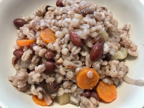Or try my Barley Oat Porridge, or Barley and Beans Porridge, adding beans, celery, turnip, carrot or any other vegetables you like.  Barley has a chewy bite which some people love.  If all that chewiness isn't your thang ~ although it is good for the jaw muscles, and all, than cut barley with oats, brown rice, or rolled kamut or white whole wheat flakes.